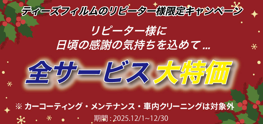 2023/12/01 リピーター様キャンペーン 全サービスを大特価でご利用頂けます!(コーティング・メンテナンス・車内クリーニングは対象外)