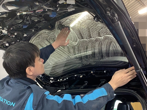 フロントドアガラスは、カットシステムで型を取ったフィルムを
