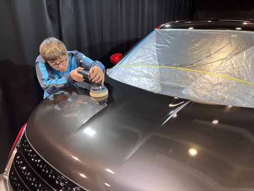 塗装修理したボンネットの磨き直しを行います。