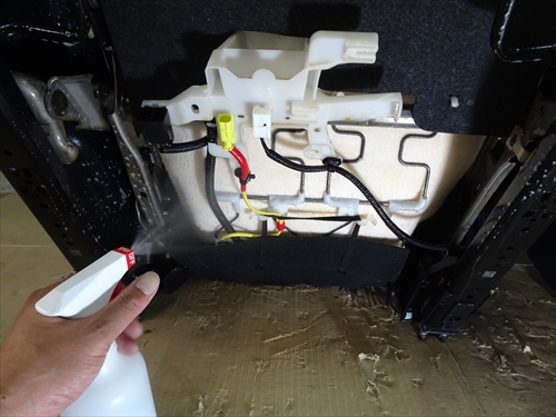 しっかりと乾燥させて、シート等を元通りに組み付けたら再度消臭剤を散布していきます。