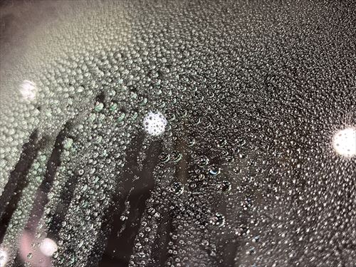ガラス研磨をした向かって左側は、吹き掛けた水が親水状態で流れ落ちてますが、まだ磨いていない右側は不純物に水が付着して残ってしまっています。