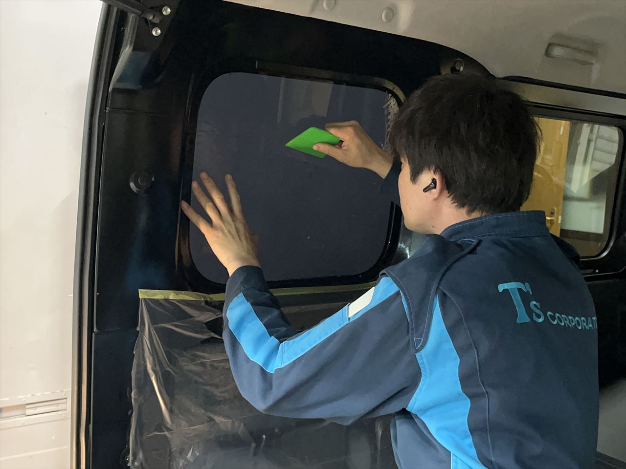 フロントガラスに光反射フィルムRFⅡを、後部ガラス一式には断熱スモーク3%を施工していきます。
