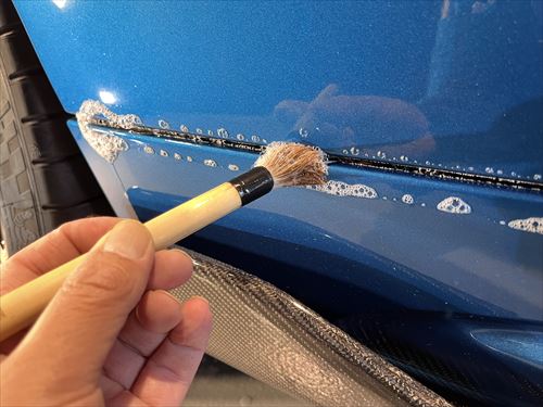 この他にもパーツの継ぎ目やモールの溝、エンブレム周りやグリル部分、給油口の中やナンバープレートの裏側まで、特殊溶剤と熊野筆等を使って細部に至るまでクリーニングしていきます。
