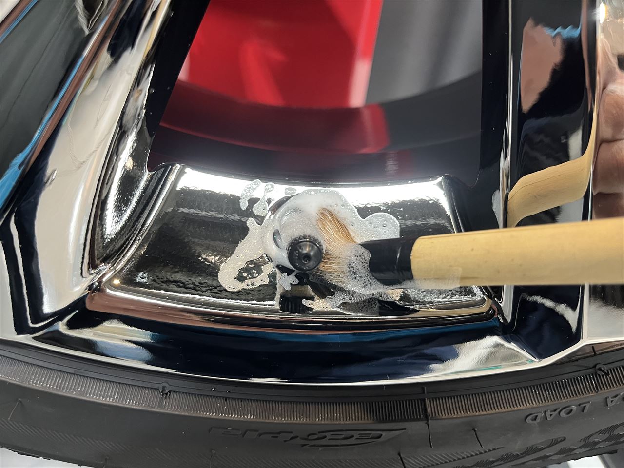 ホイール専用のガラスコーティングと防汚性UPコーティングを施工していきます。