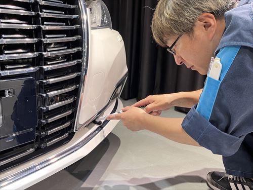 この他にもパーツの継ぎ目やモールの溝、エンブレム周りやグリル部分、給油口の中やナンバープレートの裏側まで、特殊溶剤と熊野筆等を使って細部に至るまでクリーニングしていきます。