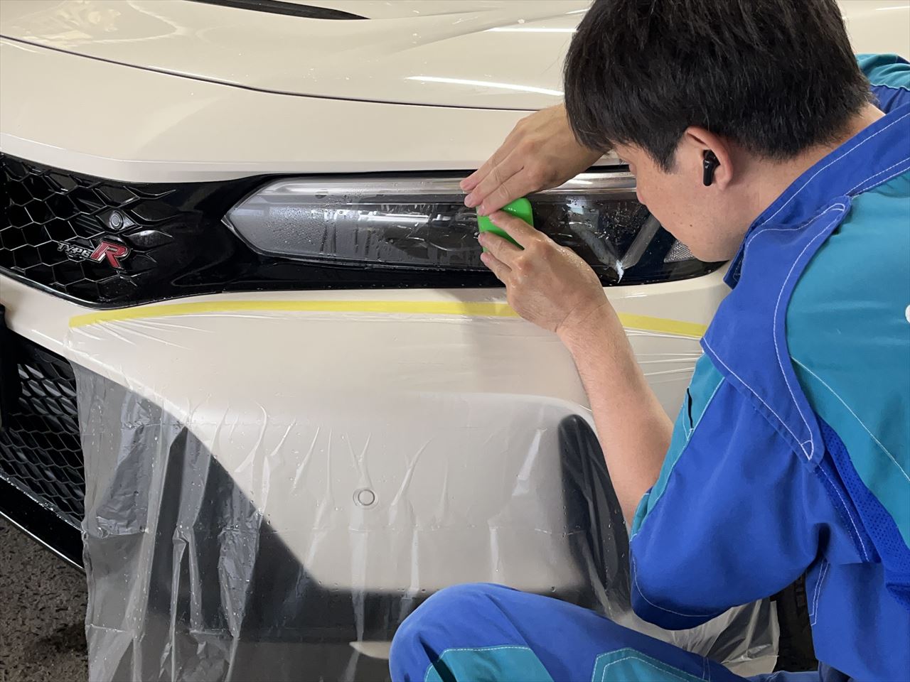 特殊溶剤を使って不純物を分解除去クリーニングしたら、カープロテクションフィルムを貼っていきます。