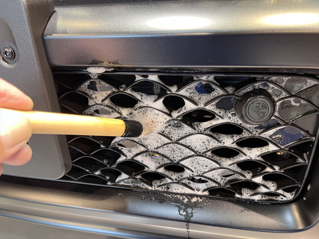 この他にもパーツの継ぎ目やモールの溝、エンブレム周りやグリル部分、給油口の中やナンバープレートの裏側まで、特殊溶剤と熊野筆等を使って細部に至るまでクリーニングしていきます。