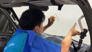 続いて、フロントドアガラスとフロントベンチガラスの施工に取り掛かります。