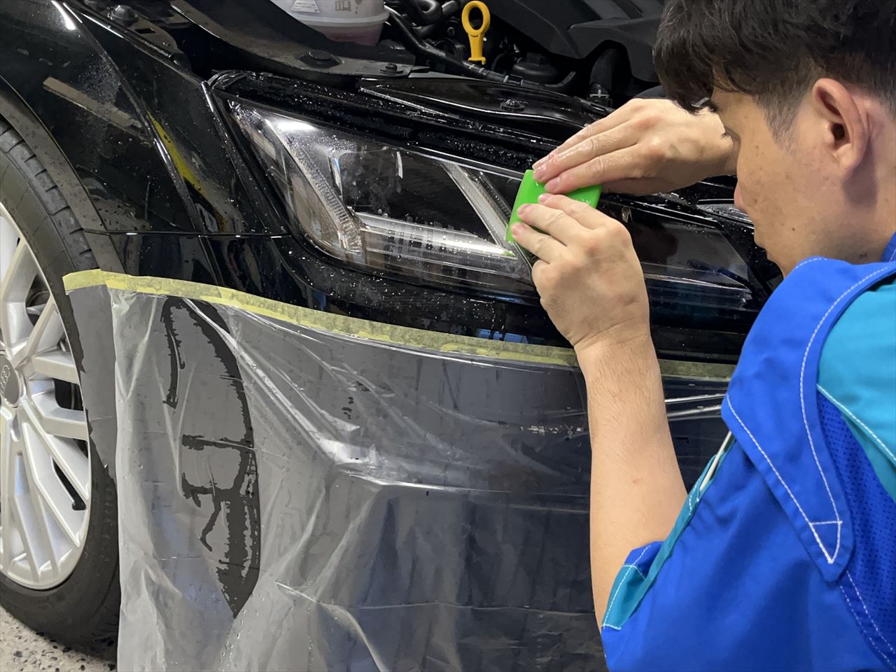 特殊溶剤を使って不純物を分解除去クリーニングした後、カープロテクションフィルムを貼っていきます。
