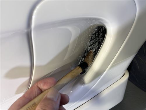 この他にもパーツの継ぎ目やモールの溝、エンブレム周りやグリル部分、給油口の中やナンバープレートの裏側まで、特殊溶剤と熊野筆等を使って細部に至るまでクリーニングしていきます。