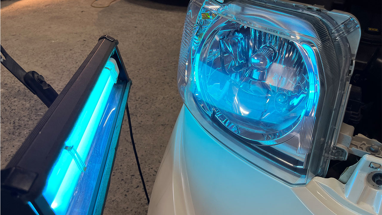 劣化被膜を研磨除去したら、ここから新たな被膜を形成させて、その被膜を特殊ランプで硬化させていきます。