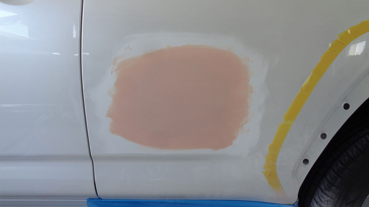 パールホワイトなので、色を合わせるためにもフロントドアまで塗装修理が必要になります。