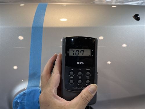 まずは特殊照明を配置したコーティングブース内において、塗装膜厚計や光沢計等を用いながらボディ状態をチェックをしていきます。
