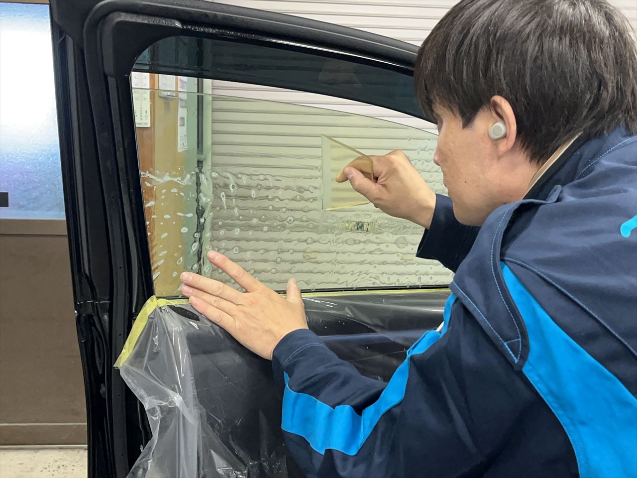 フィルムの型取りや養生、内張りの取り外し等の準備が出来たら施工に取り掛かります。