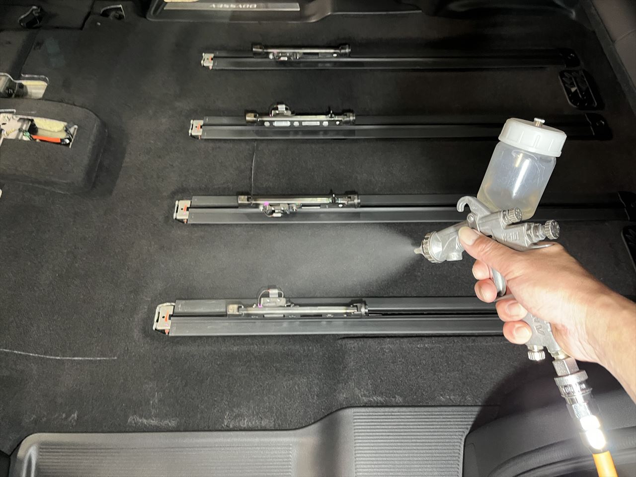 シートやマット等をしっかりと乾燥させた後、元通りに組み付けたら更に消臭剤を散布していきます。