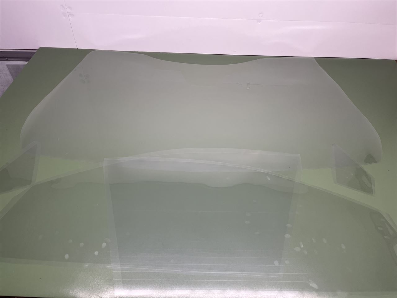 ガラス単体の可視光線透過率を測定して問題がないことを確認しましたので、フロントガラスとフロントドアガラスに透明断熱フィルムIRヒートカットを施工していきます。