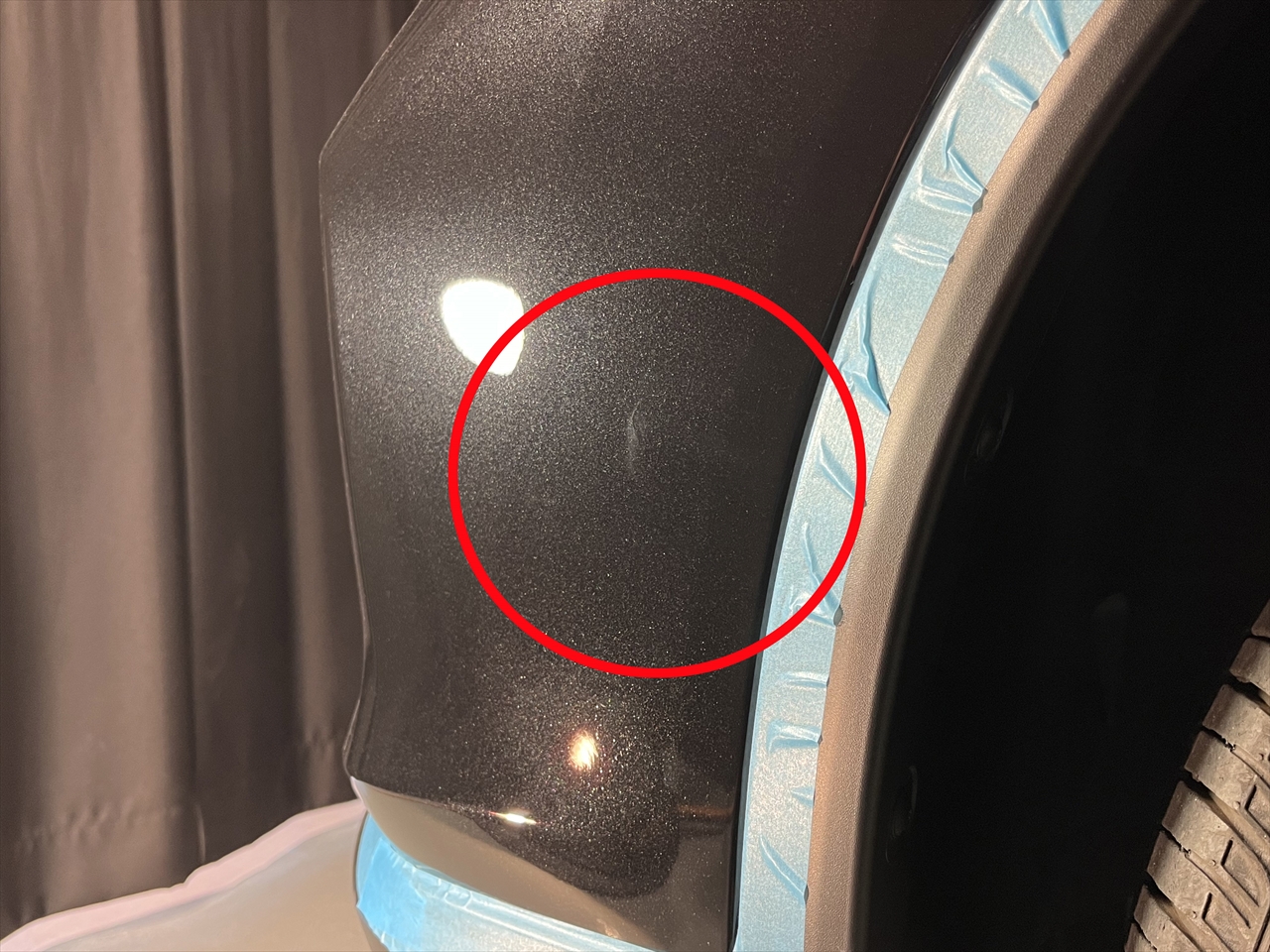 フロントバンパーは塗装済みのものに交換をしていますが、やはり微細な傷がありますし、塗装修理したフェンダー部分には磨き跡等のダメージが確認出来ます。