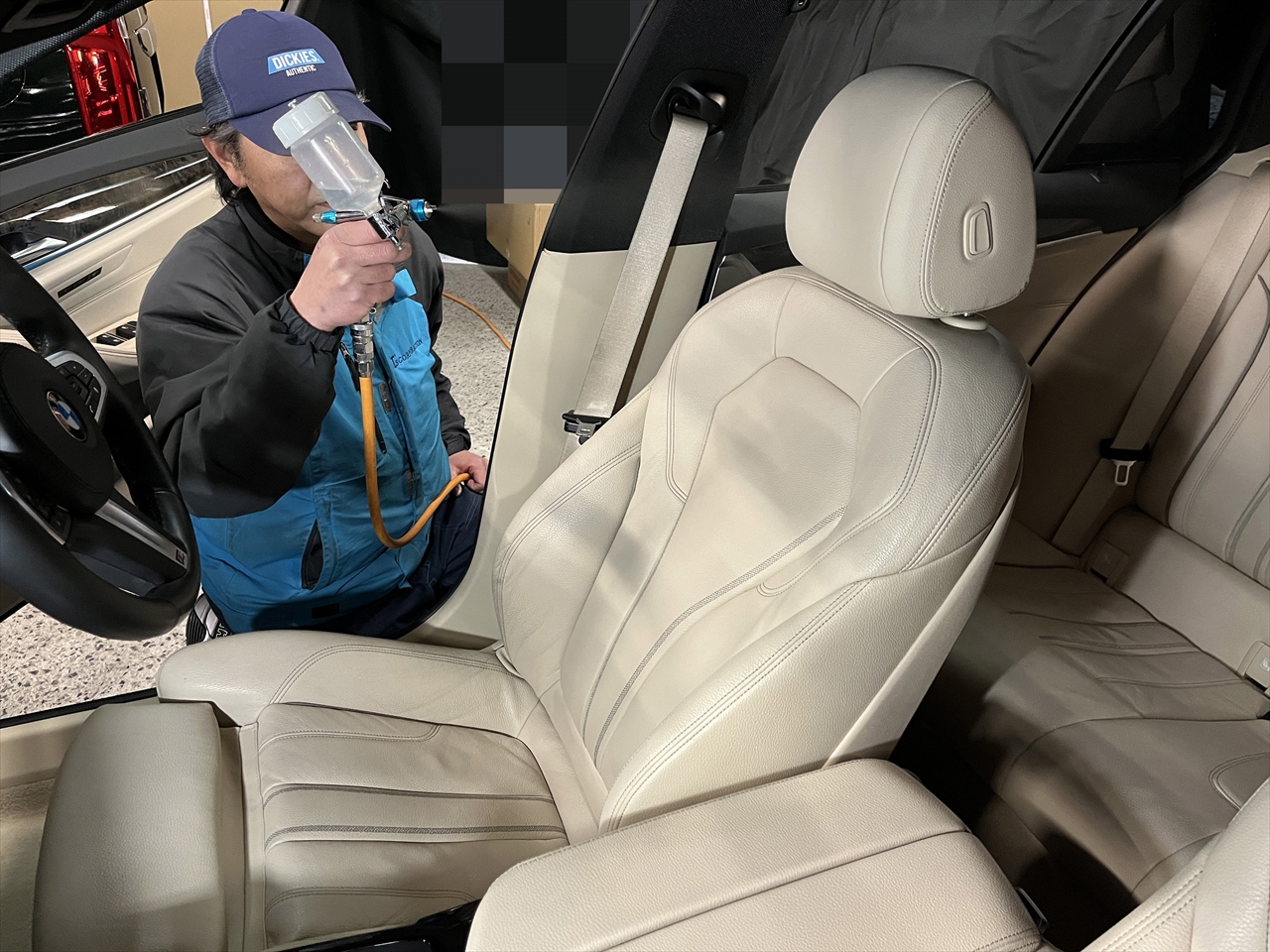 車内クリーニングに引き続き、レザーコーティングを施工していきます。