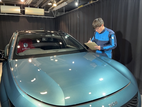 まずは特殊照明を配置したコーティングブース内において、塗装膜厚計や光沢計等の計器類を用いながらボディチェックをしていきます。