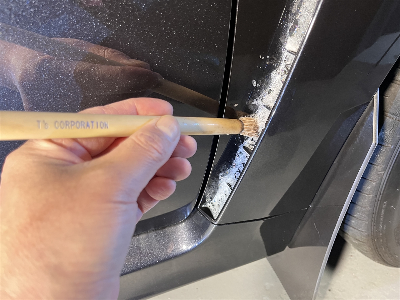 この他にもパーツの継ぎ目やモールの溝、エンブレム周りやグリル部分、給油口の中やナンバープレートの裏側まで、特殊溶剤と熊野筆等を使って細部に至るまでクリーニングしていきます。