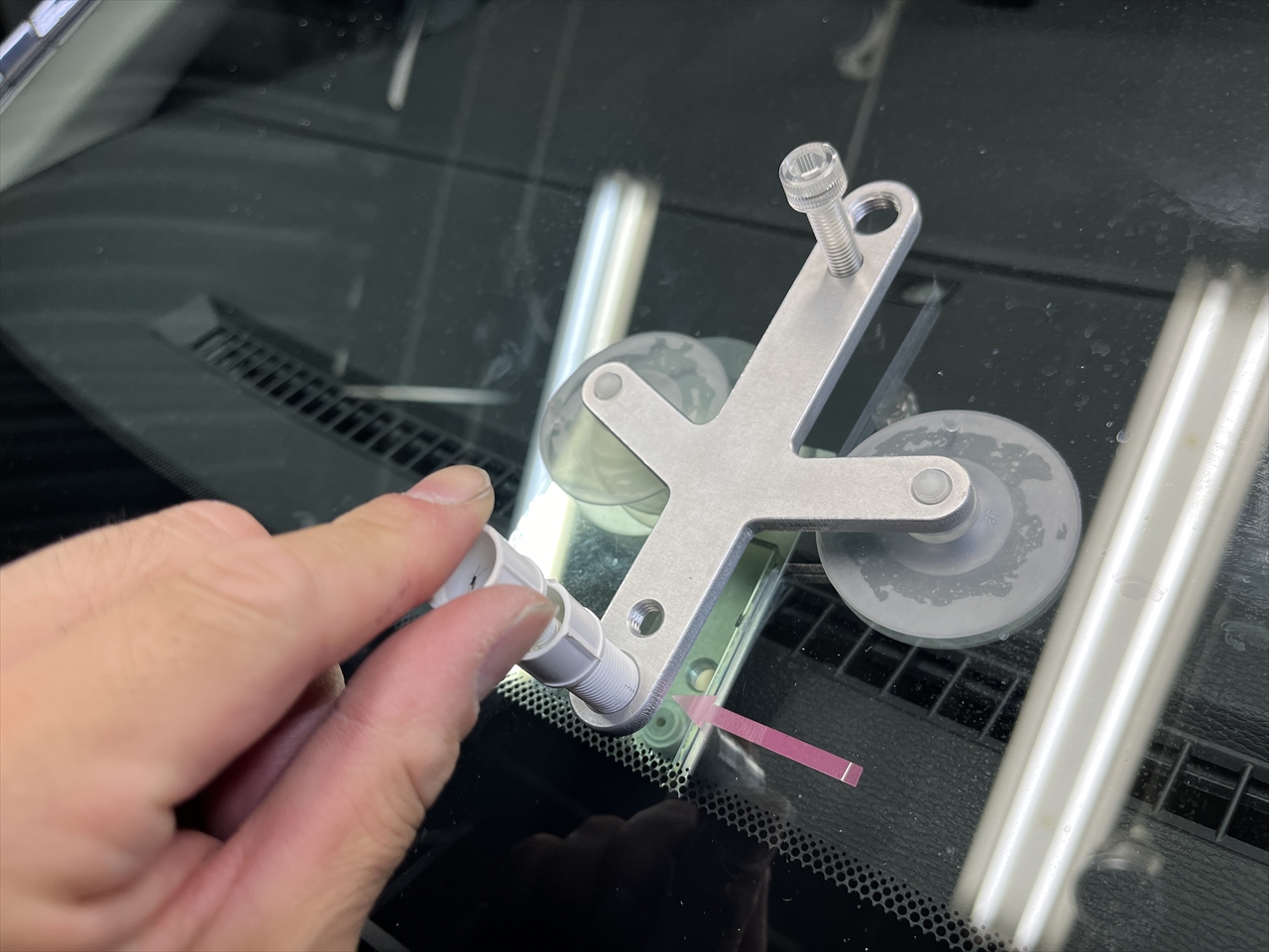 設計の段階からこだわって作ったティーズフィルムオリジナルフロントガラスリペアキットを使用して、ヒビの末端までレジンを注入していきます。