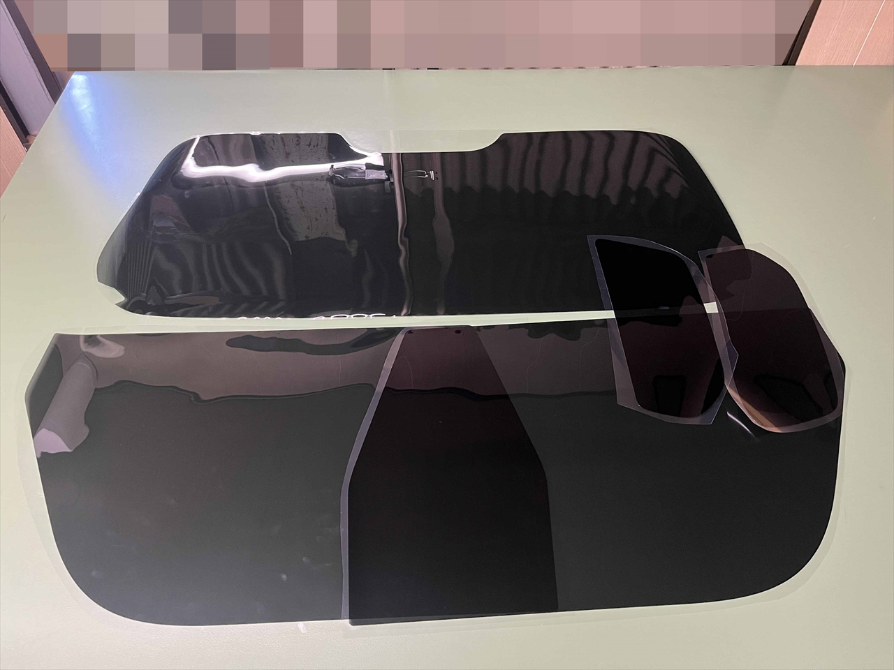 後部ガラス一式に断熱スモーク15%を施工していきます。