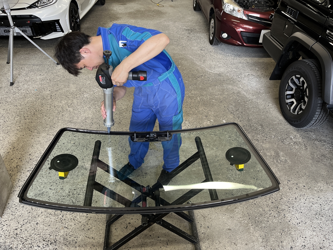 新たに取り付けるフロントガラスに接着剤を均一にインストールしていきます。