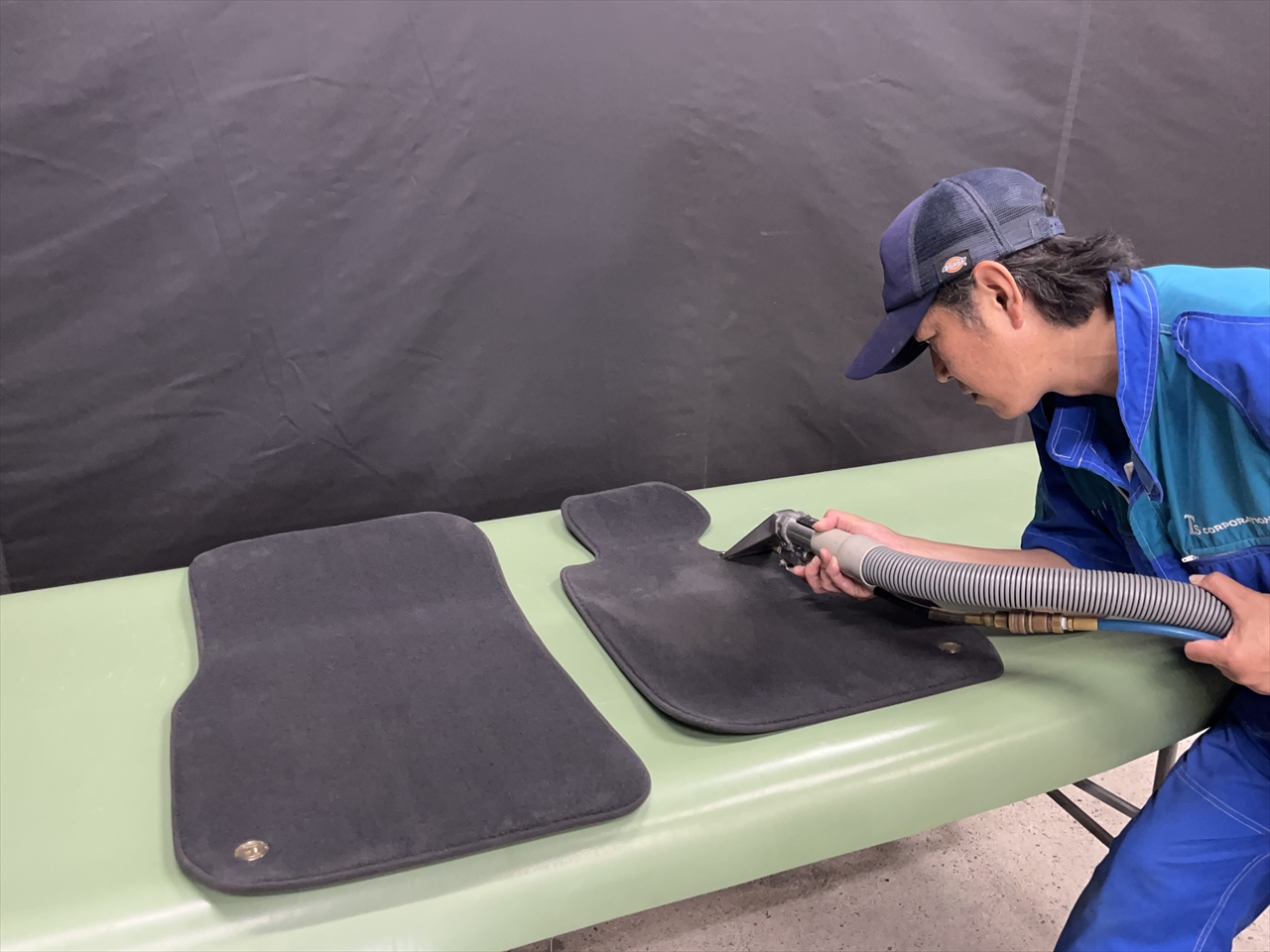 しっかりと乾燥させた後、フロアマットを元通りに取り付けたら更に消臭剤を散布していきます。