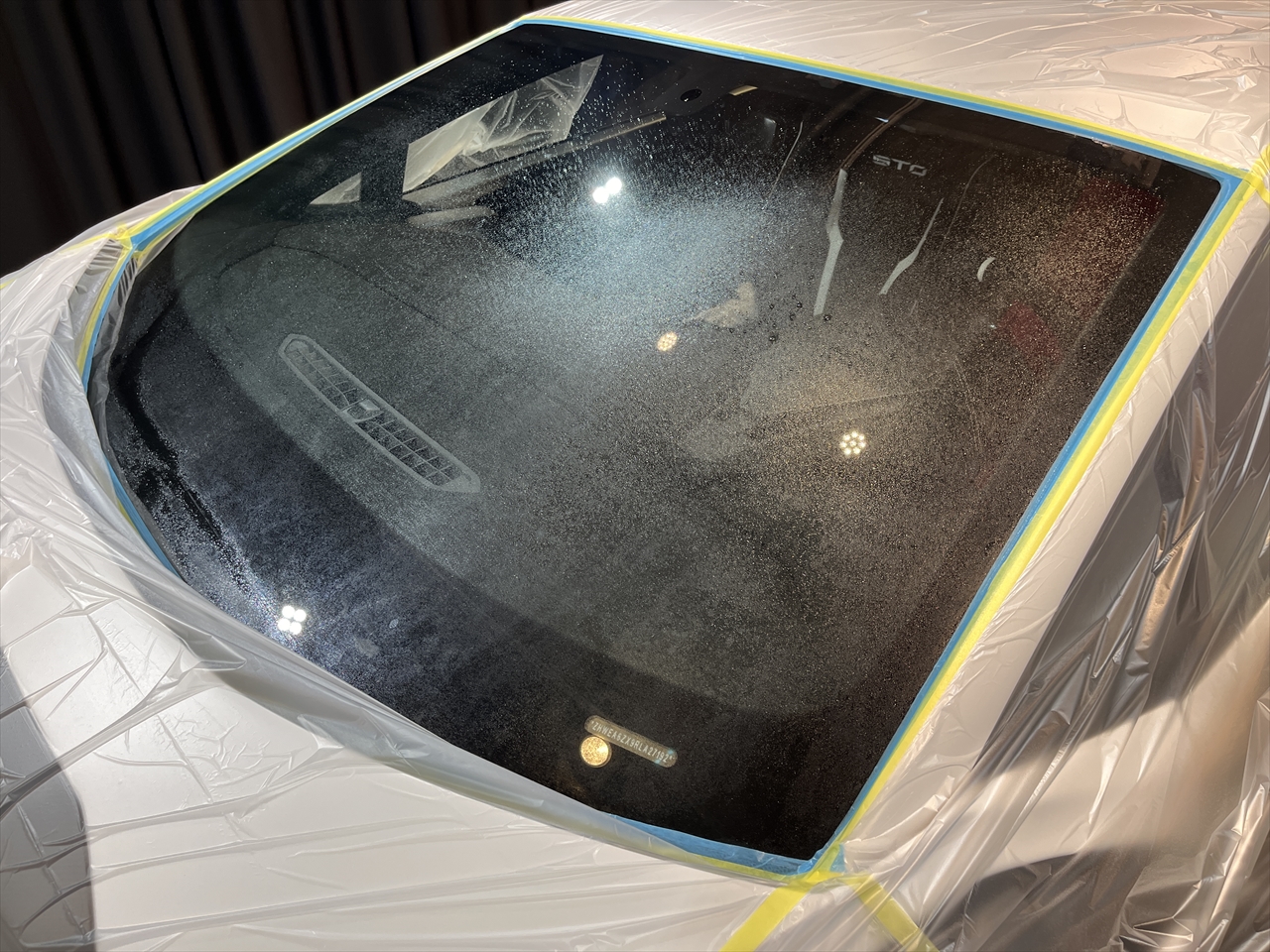 フロントガラスには、この後プロテクションフィルムを施工しますのでガラス研磨のみを、それ以外はガラス撥水コーティングまで施工していきます。