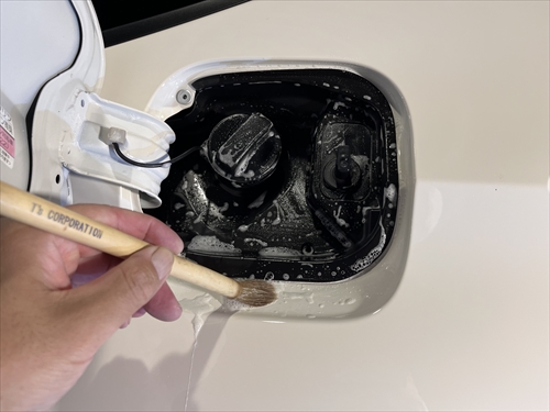 この他にもパーツの継ぎ目やモールの溝、エンブレム周りやグリル部分、給油口の中やナンバープレートの裏側まで、特殊溶剤と熊野筆等を使って細部に至るまでクリーニングしていきます。
