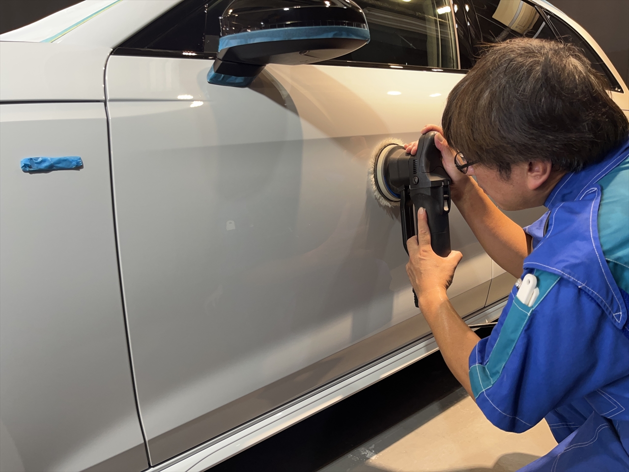 新車の塗装を壊すことなく、極力負担を掛けない研磨工法でツヤ・光沢を引き出していきます。