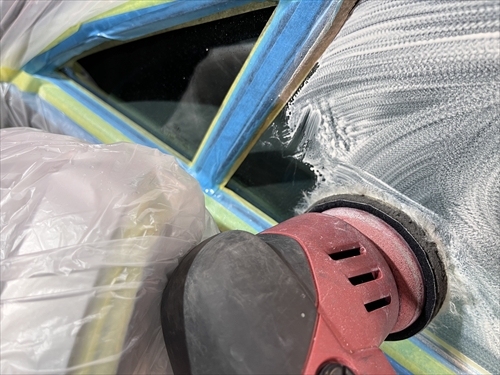 特殊溶剤とサンダーやポリッシャー等の研磨機材を使用してガラスを磨いていきます。