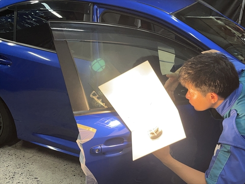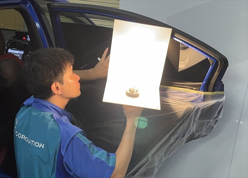 フィルム施工後は専用ライトを使ってチェックを行います。