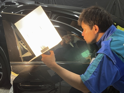 フィルム施工後は専用ライトを使ってチェックを行います。