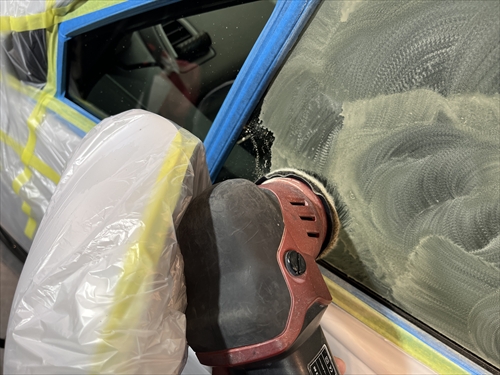 特殊溶剤とサンダーやポリッシャー等の研磨機材を使用してガラスを磨いていきます。
