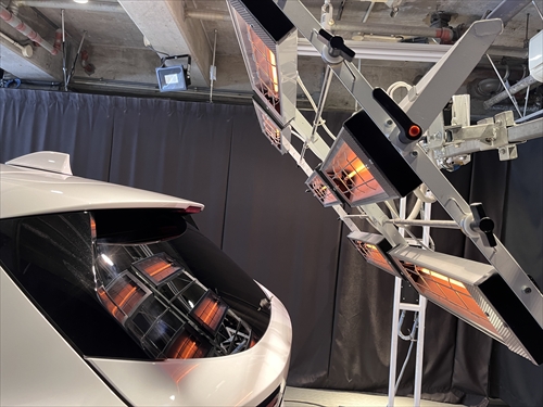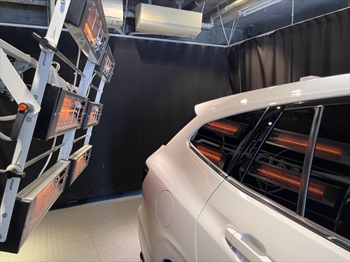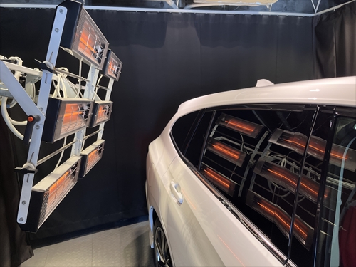 ガラス撥水コーティング施工後は、ヒーター乾燥処理をしていきます。