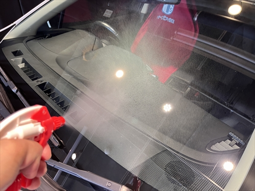 ガラスを磨いた後、再度フロントガラス全体に水を吹き掛けてみると・・・