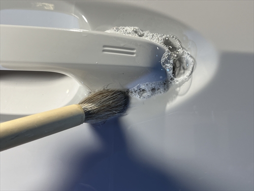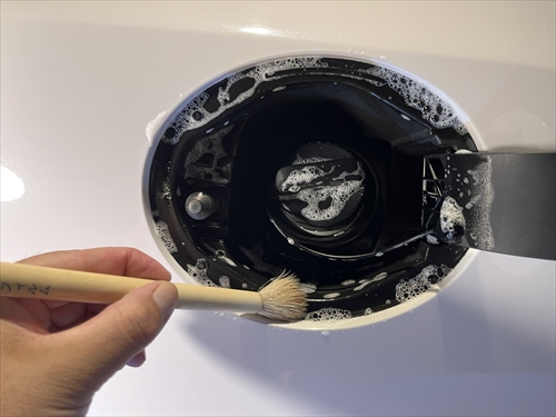 この他にもパーツの継ぎ目やモールの溝、エンブレム周りやグリル部分、給油口の中やナンバープレートの裏側まで、特殊溶剤と熊野筆等を使って細部に至るまでクリーニングしていきます。
