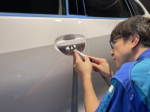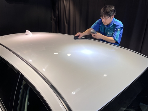 セラミックホワイトなので屋外では一見キレイに見えますが、新車から3年半程度経過していることもあり、厳しい特殊照明下で確認するとこのようにボディ全体にダメージが確認できました。