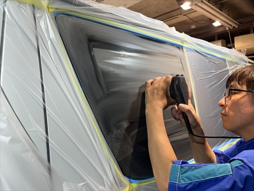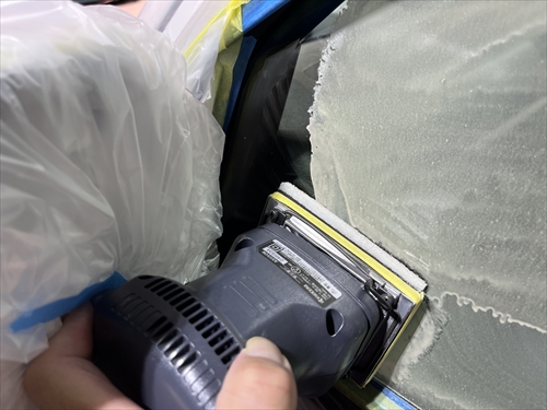 特殊溶剤とサンダーやポリッシャー等の研磨機材を使用してガラスを磨いていきます。