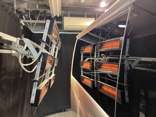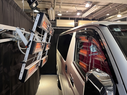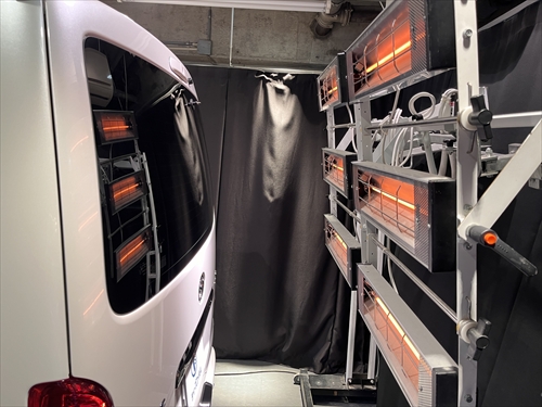 ガラス撥水コーティング施工後は、ヒーター乾燥処理をしていきます。