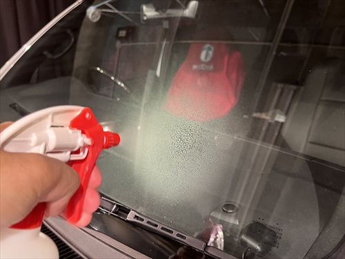 フロントガラス全体に水を吹き掛けてみると、このように不純物だらけなのがわかります。