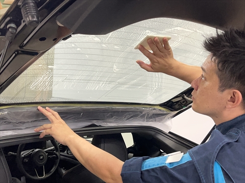 内張りの取り外しや養生等の準備ができたら、リアガラスから施工していきます。