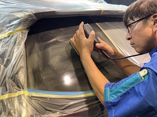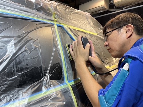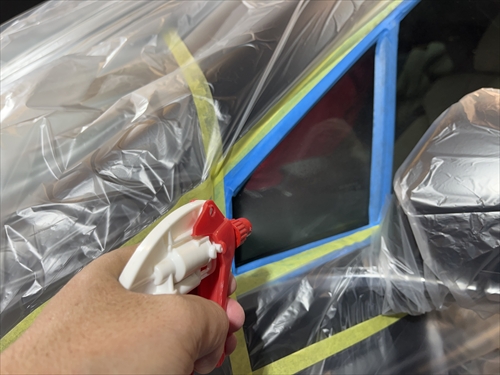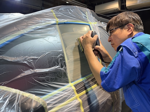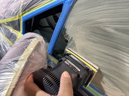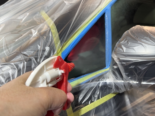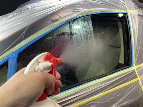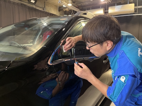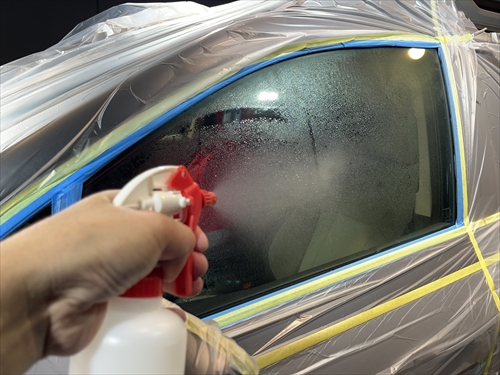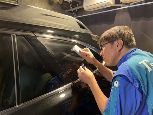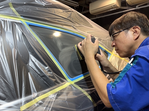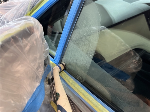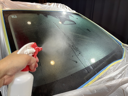 ボディを汚さないようにキッチリ養生した後、ガラスの状態をチェックしていきます。