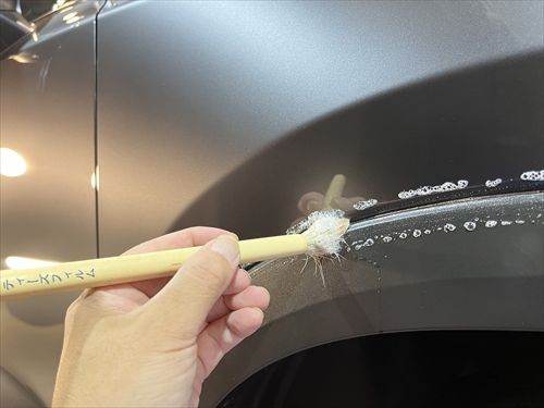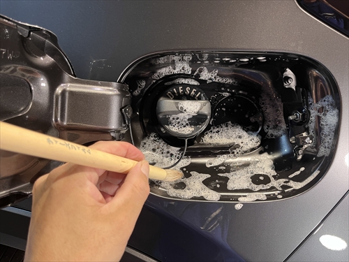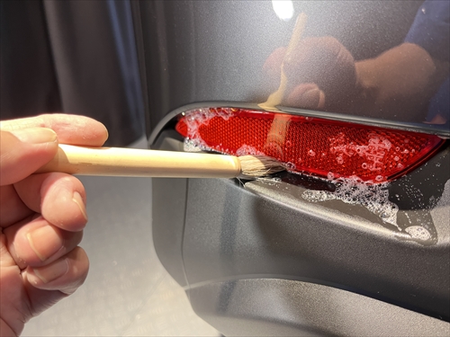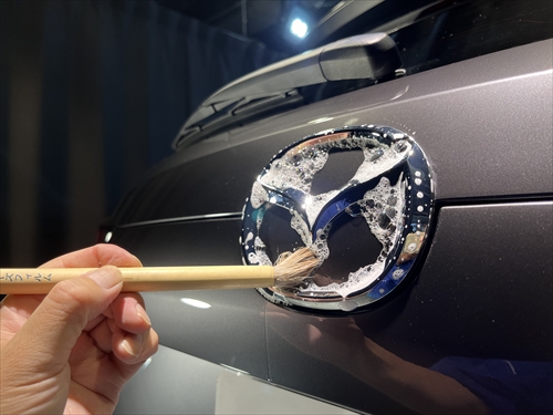 この他にもパーツの継ぎ目やモールの溝、エンブレム周りやグリル部分、給油口の中やナンバープレートの裏側まで、特殊溶剤と熊野筆等を使って細部に至るまでクリーニングしていきます。