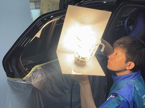 フィルム施工後は専用ライトを使ってチェックを行います。