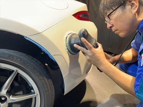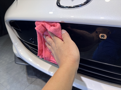 リアバンパー全体を磨いて塗装のツヤ・光沢を引き出したら、次はコーティングの部分施工に取り掛かります。