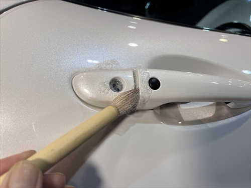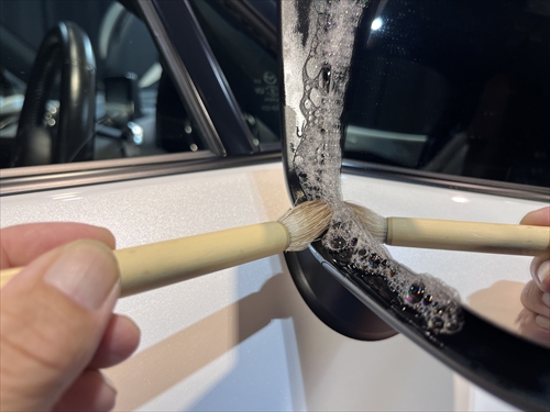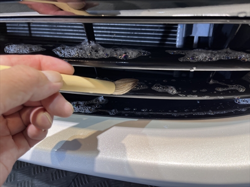 この他にもパーツの継ぎ目やモールの溝、エンブレム周りやグリル部分、給油口の中やナンバープレートの裏側まで、特殊溶剤と熊野筆等を使って細部に至るまでクリーニングしていきます。