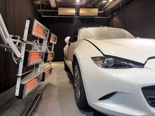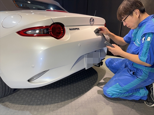 特殊照明を配置したコーティングブース内において、計器類を用いながらボディチェックをしていきます。