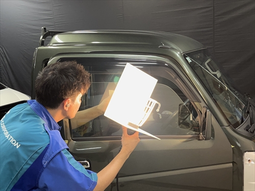 フィルム施工後は専用ライトを使ってチェックを行います。